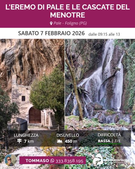 Proseguiremo poi fino ad incontrare le cascate del Menotre, formatesi proprio sotto lo sperone di roccia su cui poggia Pale, in un ambiente inaspettato e selvaggio.